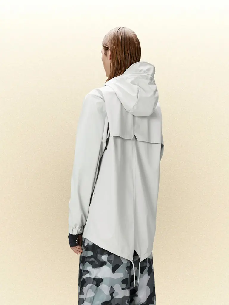 Rains' Fishtail Jacket is a unisex raincoat characterized by its pared-back aesthetic and drawstring fishtail hem. The design has a casual fit with a sloping hem. The full-length zip closure is concealed by a minimal snap-fastened placket with concealed snap fastenings. Fishtail Jacket features utility-inspired pockets, elasticated cuffs, vented back yoke, and a drawstring hood with signature built-in cap.